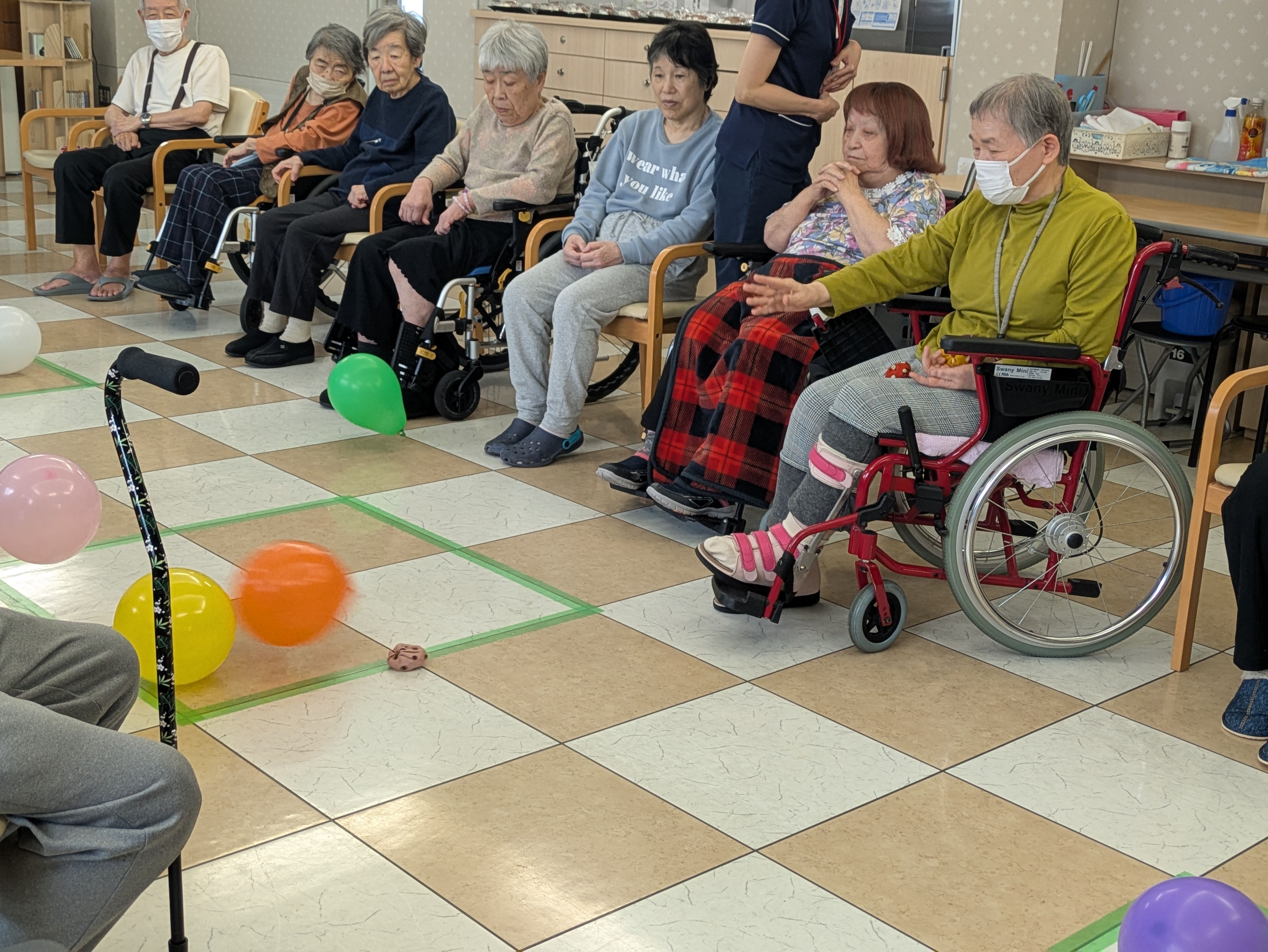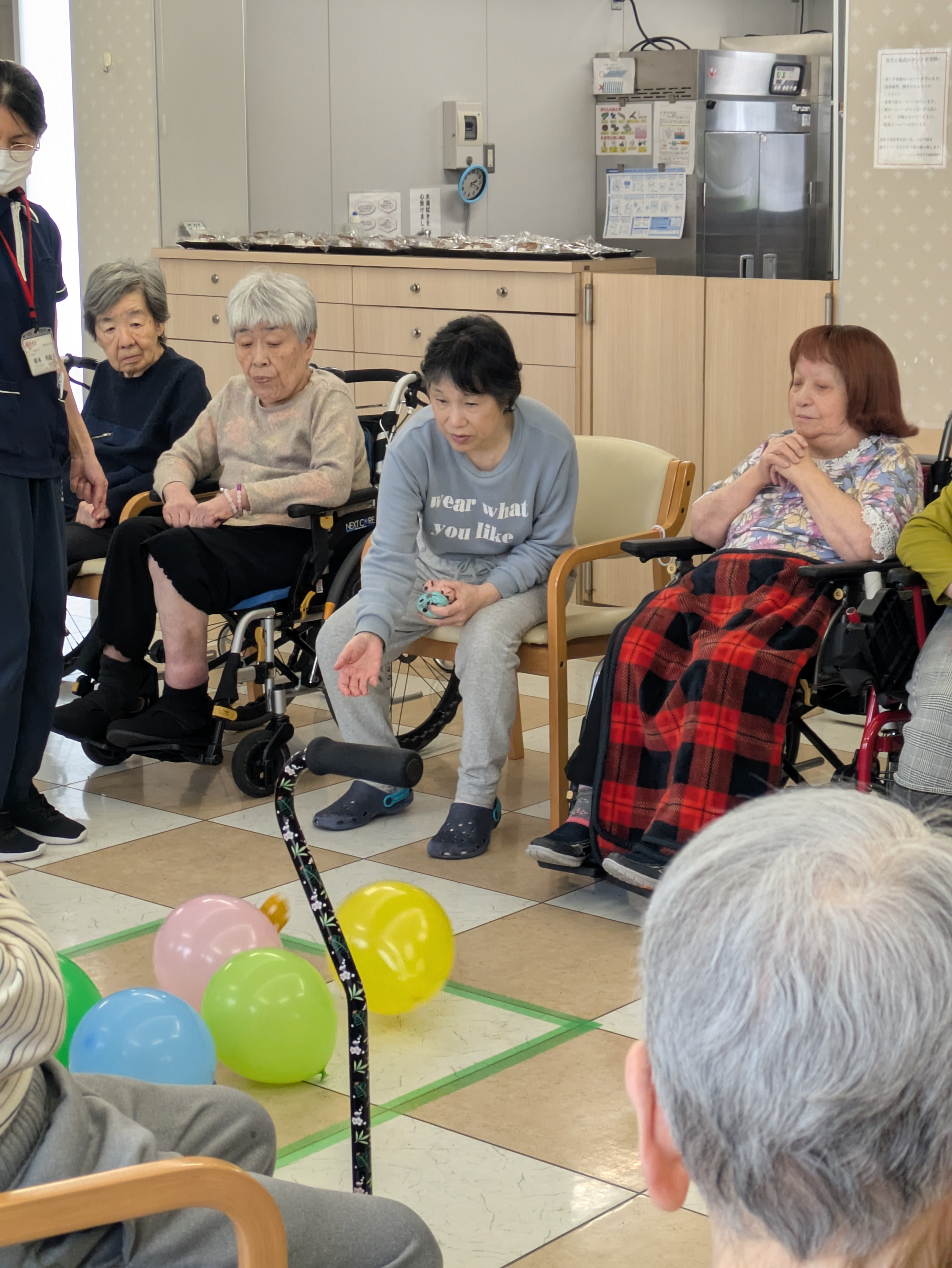 「体調はどうですか?」「ご参加なさいますか?」とスタッフがお声掛けするといつも…「ケーキ食べる!」と大きなお声で答えてくださいます。お誕生日会のレクリエーションは、皆様がご参加いただけるものを考えてご提供しています。