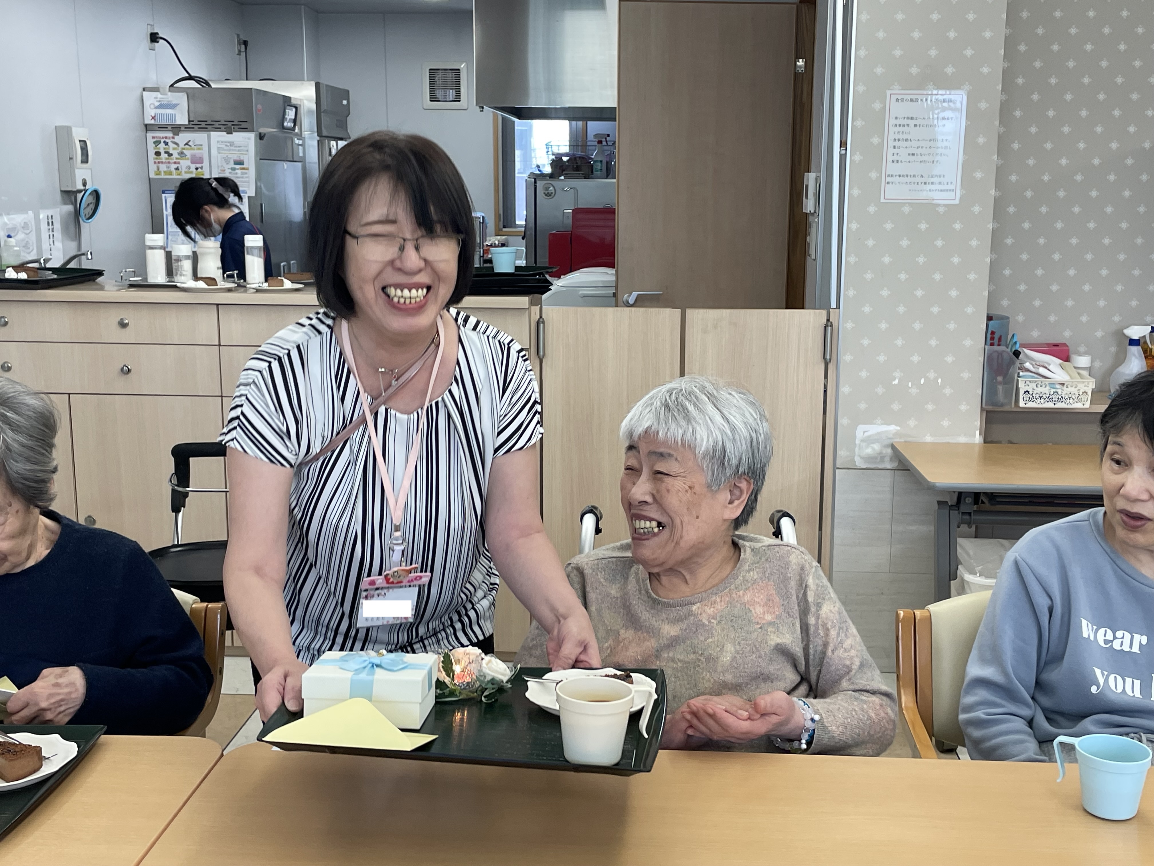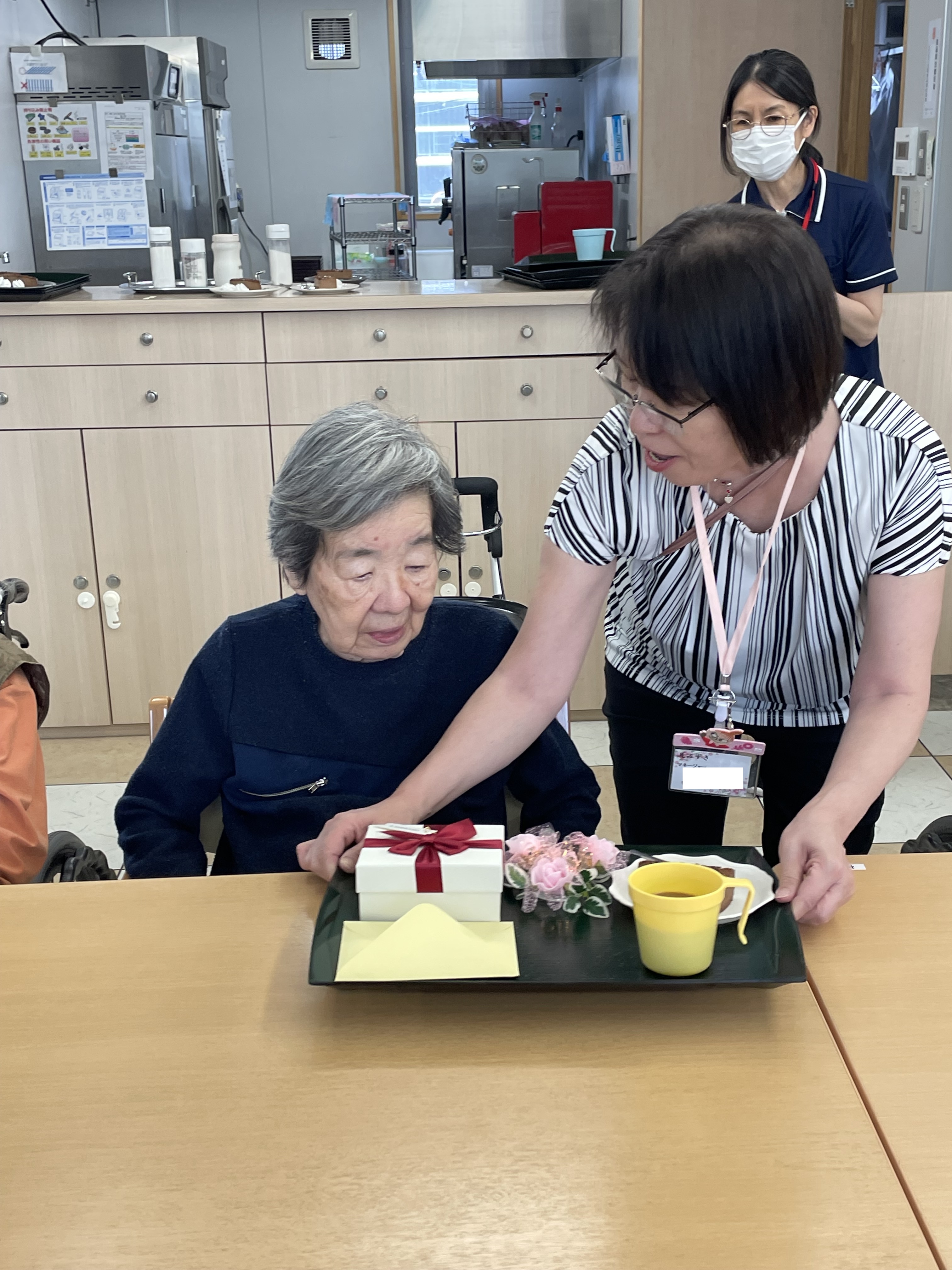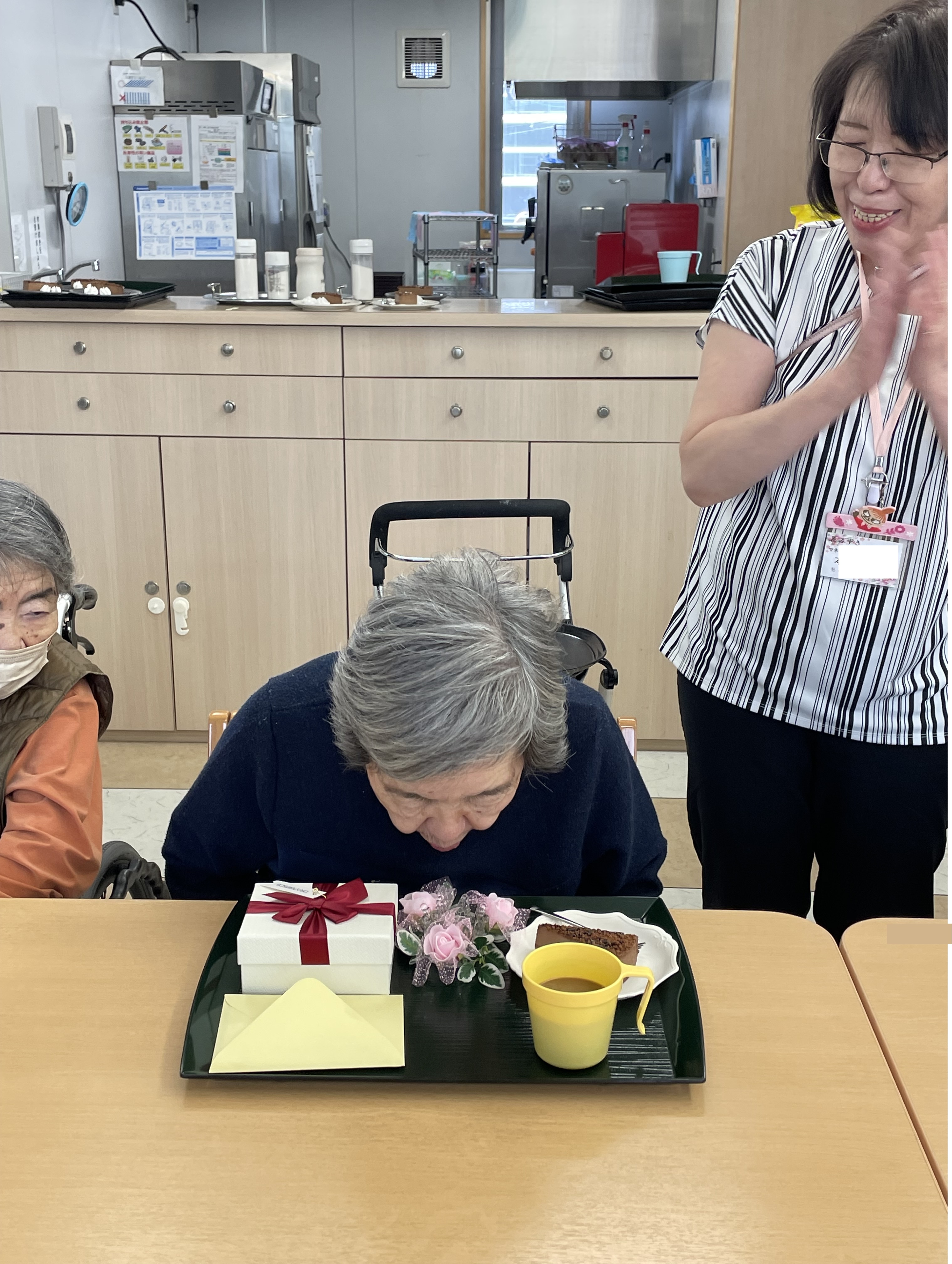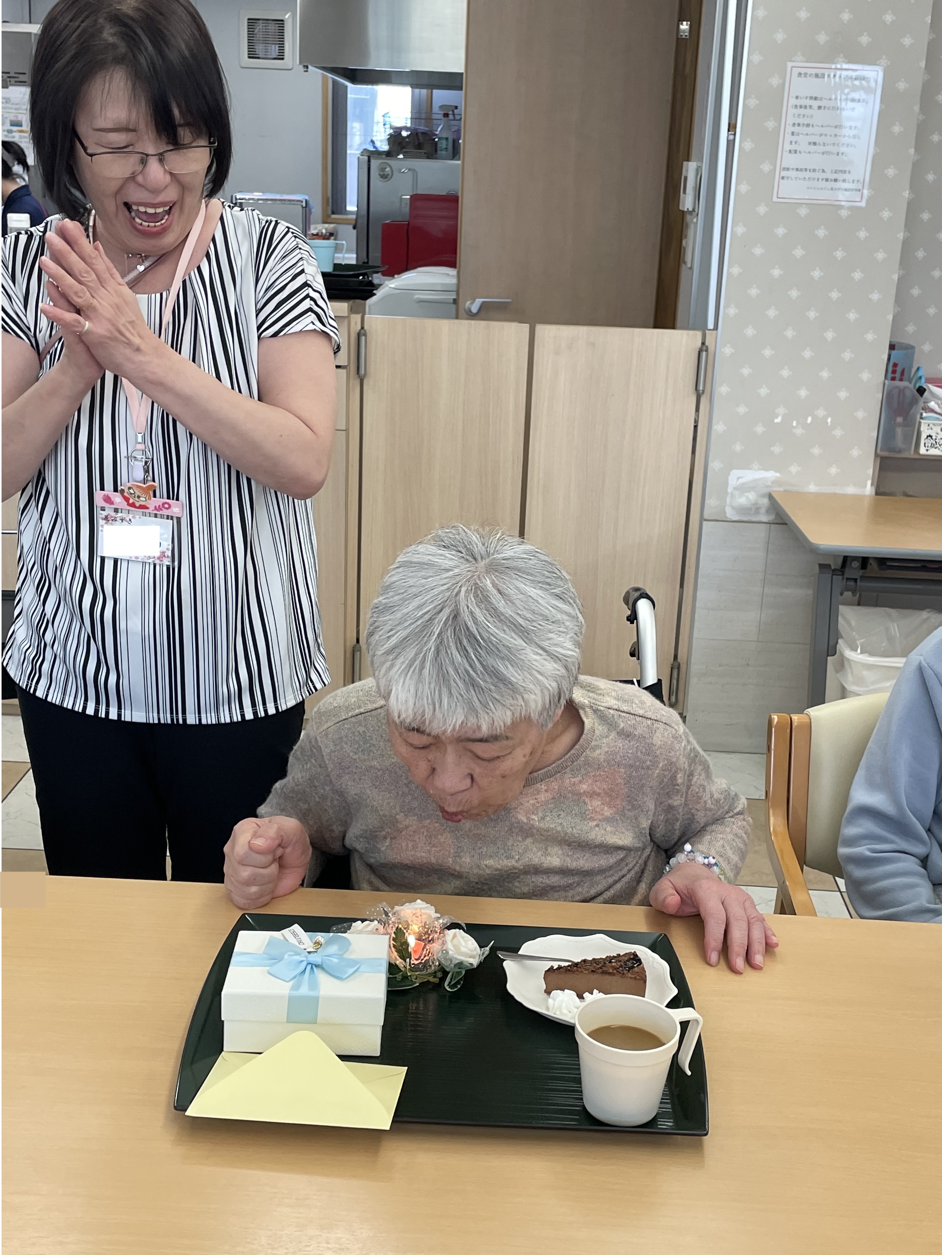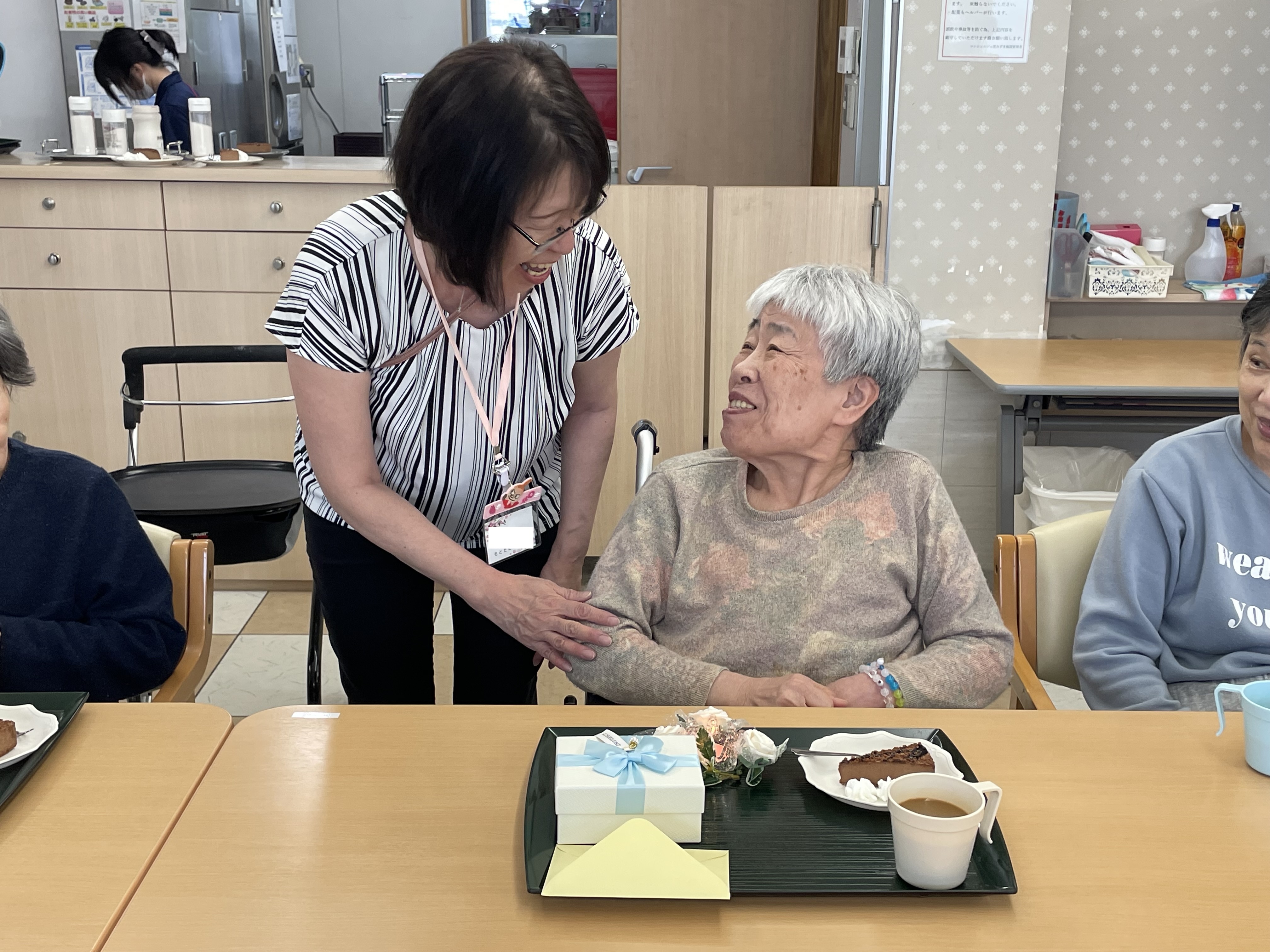 「○○さんおめでとうございます!」とケーキとプレゼントをお持ちすると「誰が?私かいな!」と大笑いです♪ この笑顔につられてこちらも笑顔になってしまいますね♪