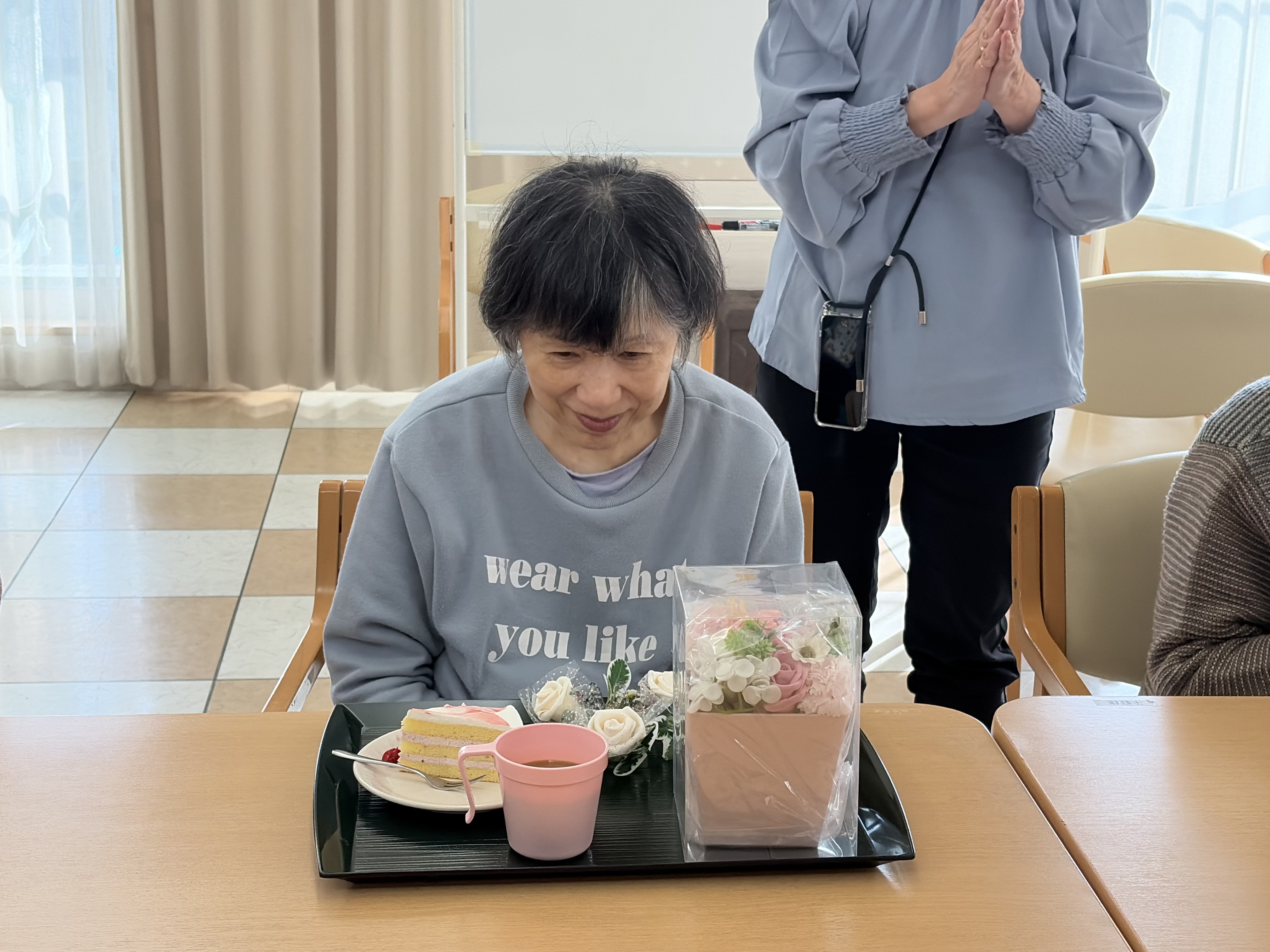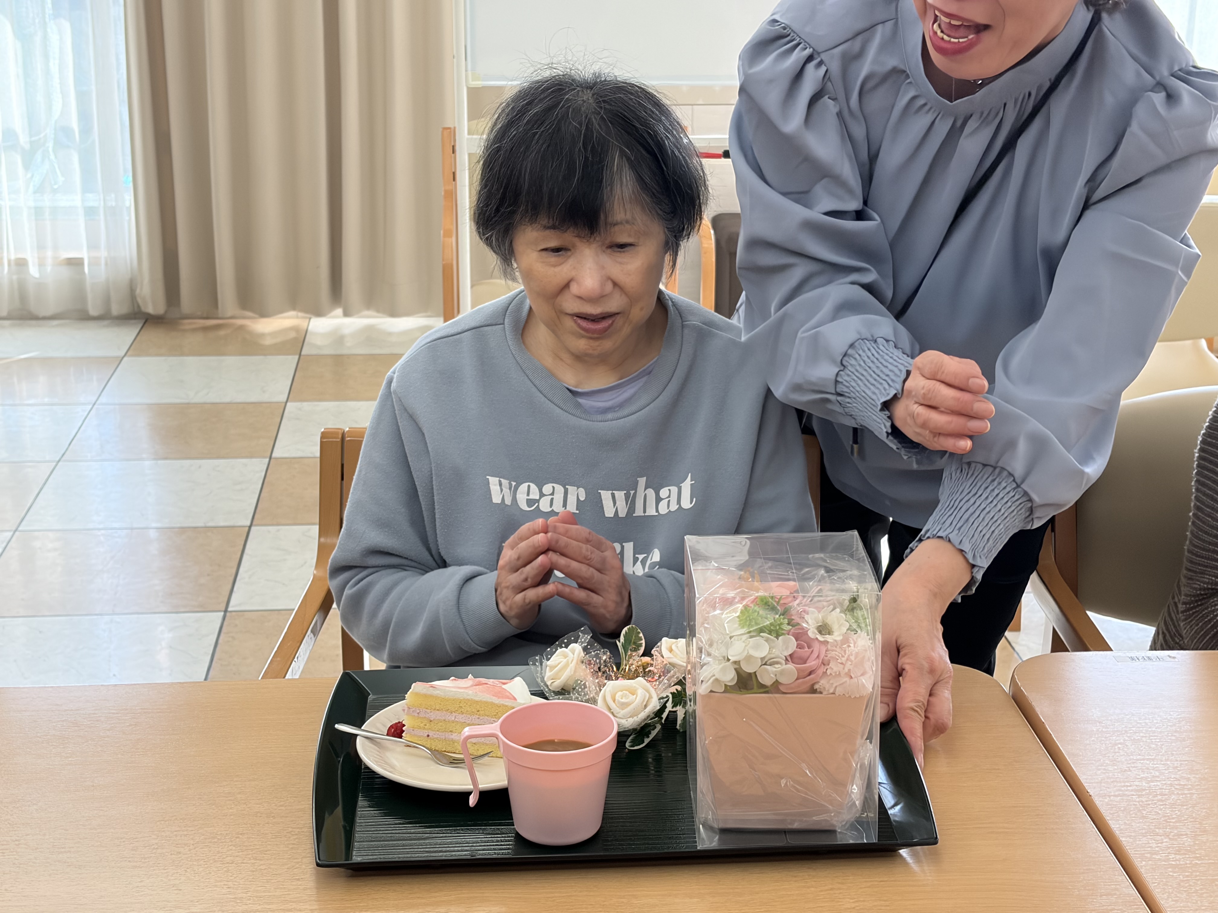 「おめでとうございます!」とプレゼントとケーキをお持ちすると、お花がいっぱいのプレゼントをご覧になって「わ~!」と嬉しそうにご覧になっていました♪