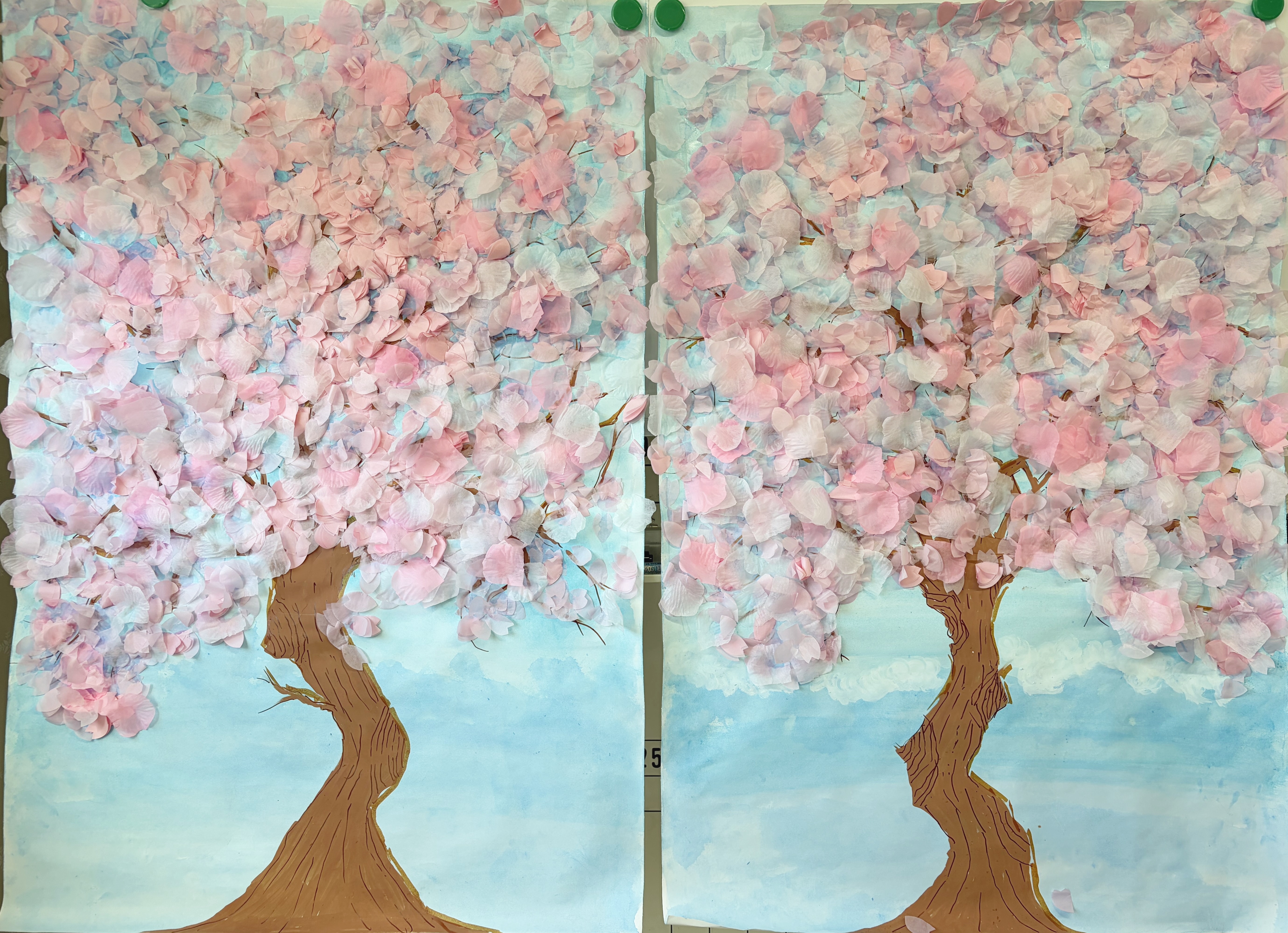皆で心を一つに☆満開の桜の木が完成いたしました。青空に映える満開の桜が美しいですね♪心もなんだかウキウキ♪してきます。