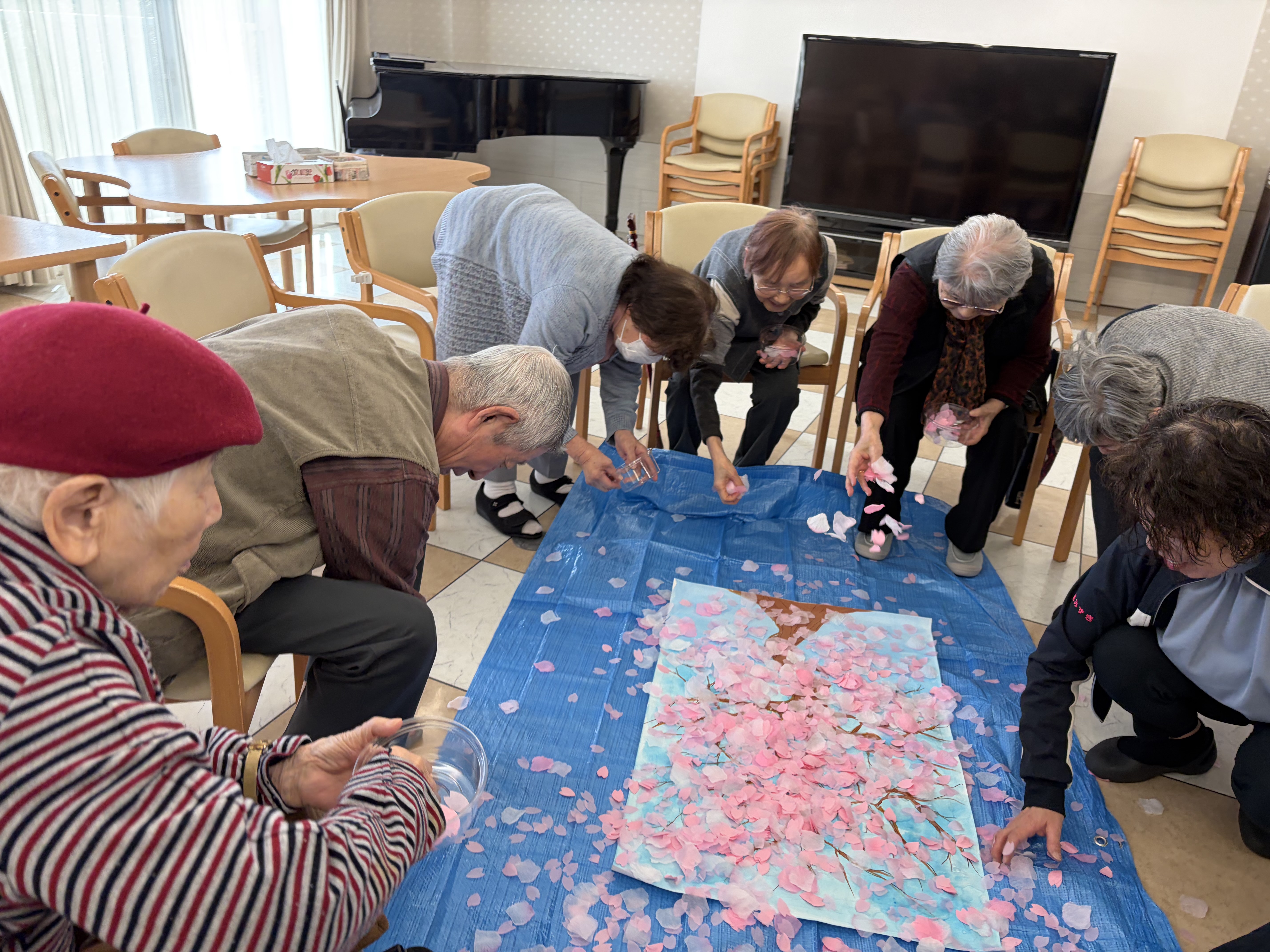 周りに飛び散った桜の花びらも、施設管理者がお手伝いをして「みんなで心を一つに!」素敵な桜の木を作っていきます♪