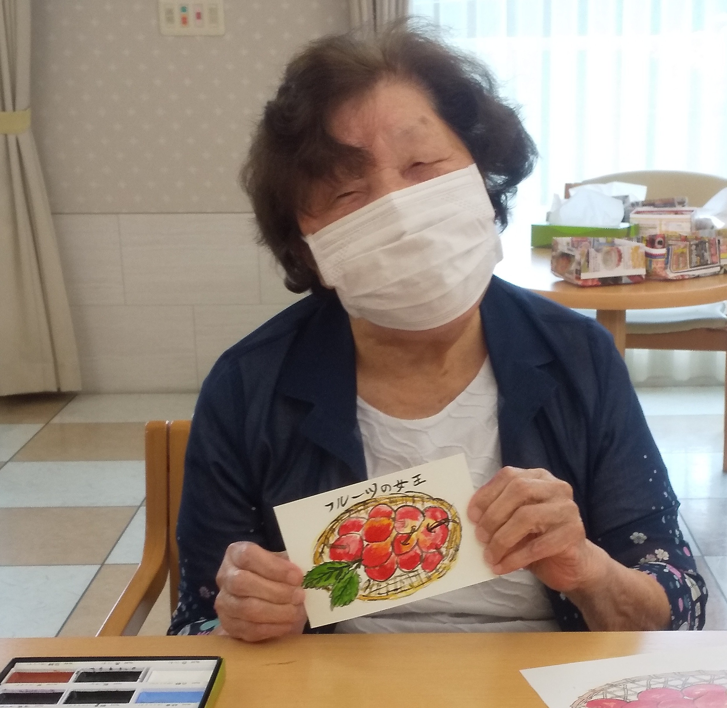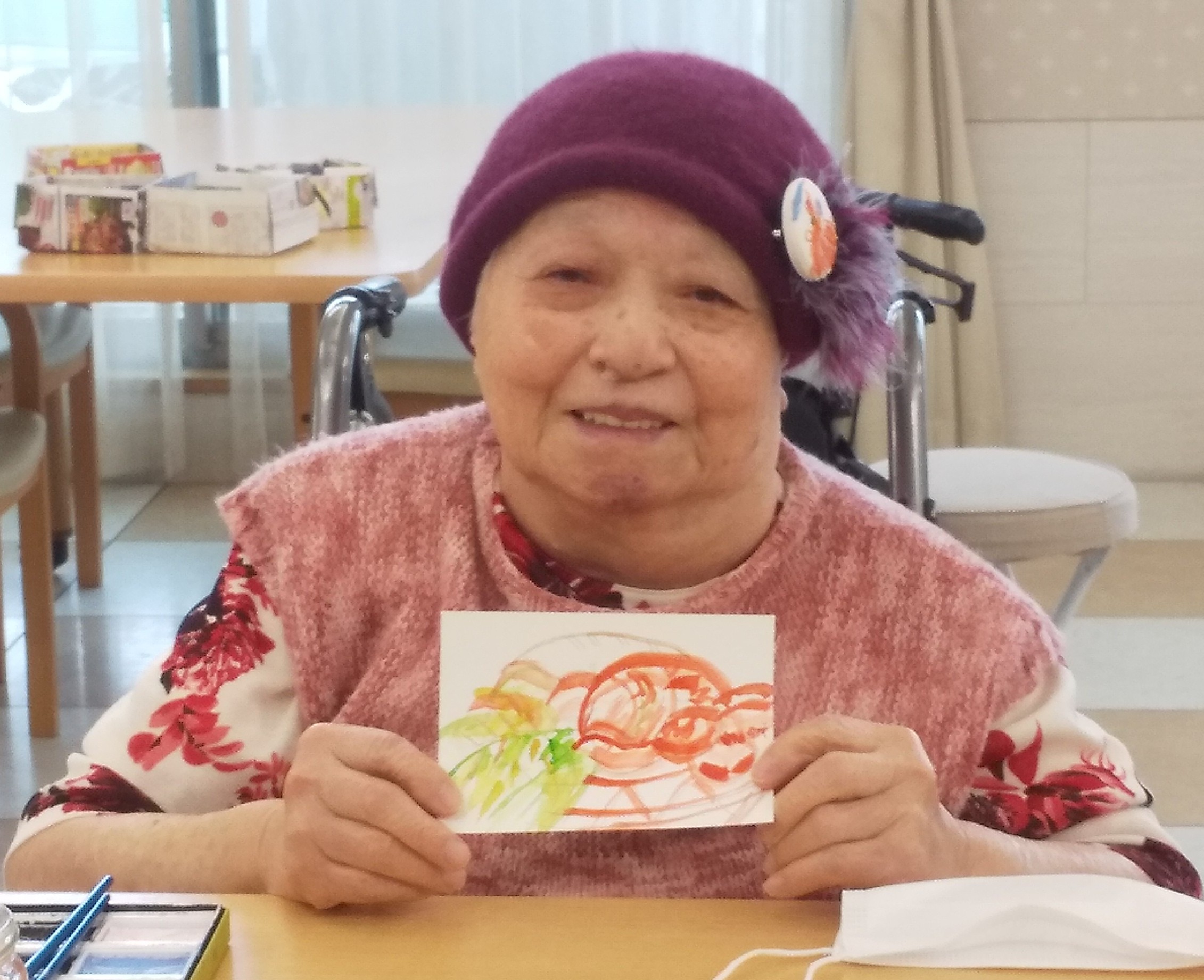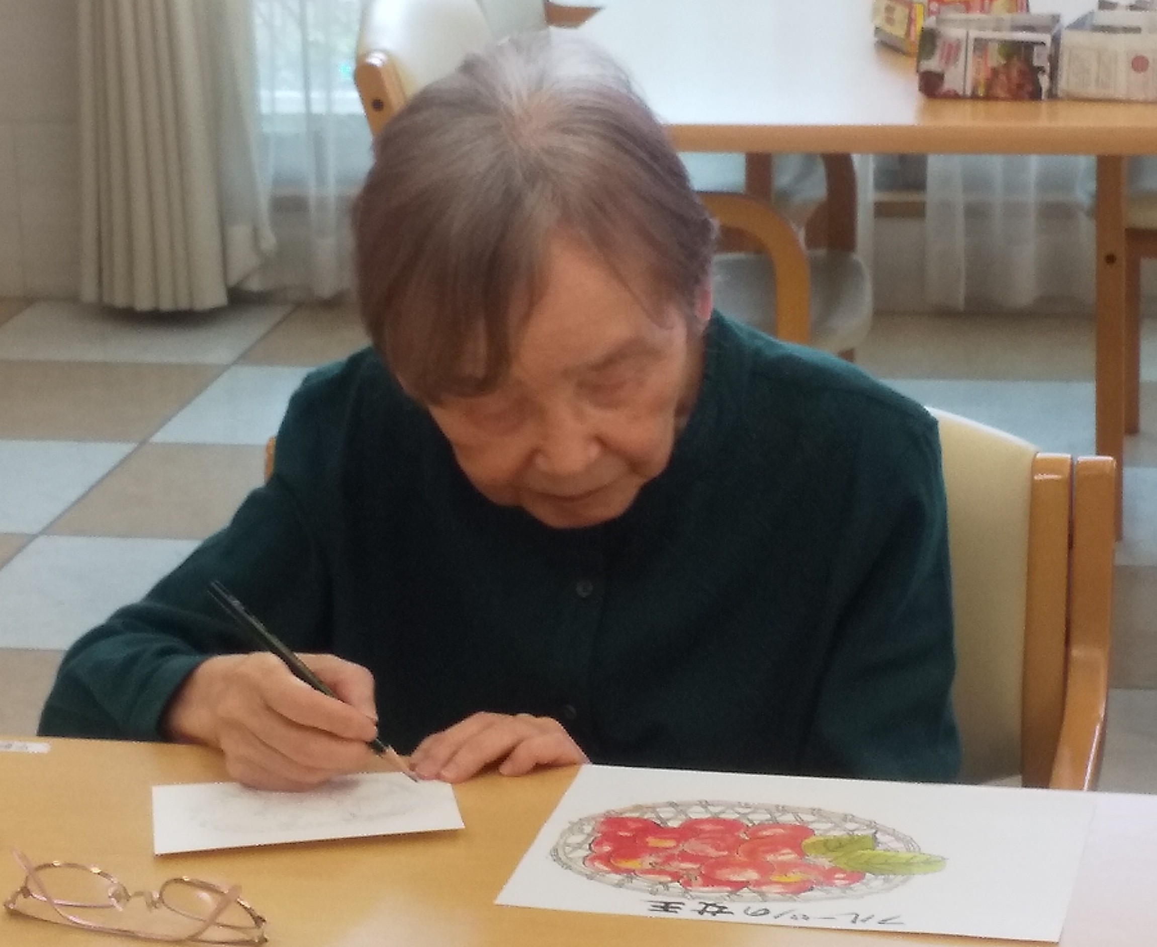 少人数での開催となりましたが絵手紙が大好きなご入居者様がご参加くださいました。ご参加いただいた皆様のご様子と完成した作品をご紹介致します ♪